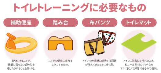 また、補助便座やおまるも、楽しくトレーニングできるように、子どもが喜ぶものをそろえておきたいですね。