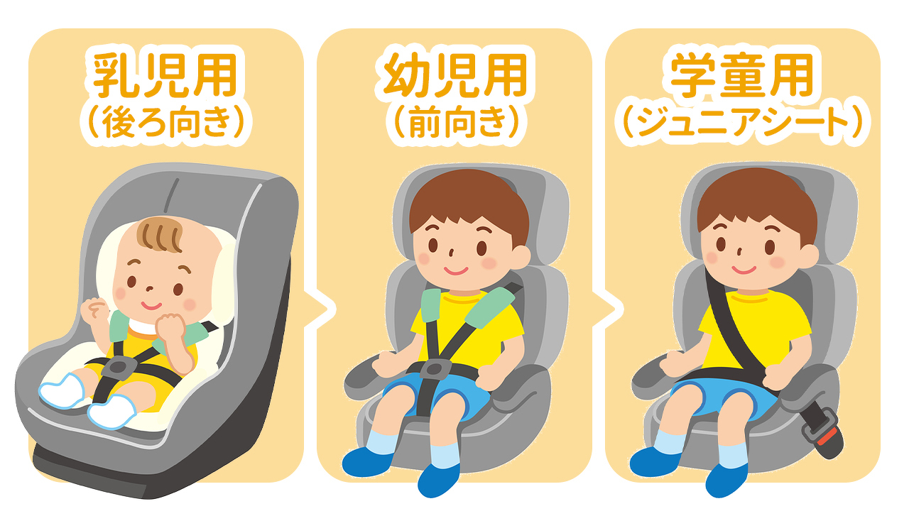 チャイルドシートには、主に乳児用(後ろ向き)・幼児用(前向き)・学童用(ジュニアシート)の3種類あり、子どもの成長にあわせて正しいチャイルドシートを選びましょう。