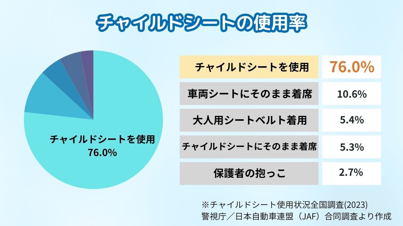 2023年の警察庁と日本自動車連盟(JAF)が合同調査を行った「チャイルドシート使用状況調査(2023年調査結果)」によると、6歳未満全体の使用率は76.0%となっています。