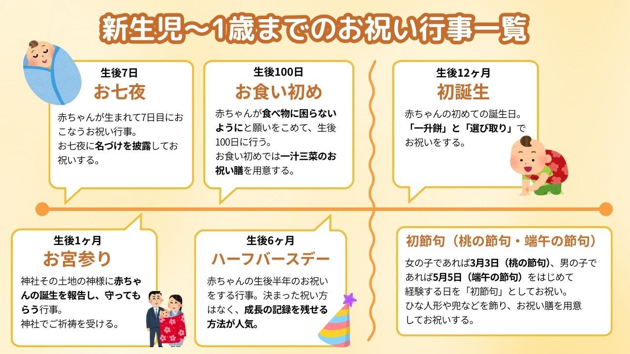 赤ちゃんが生まれてからはじめての誕生日を迎えるまでには、主に6つの行事があります。