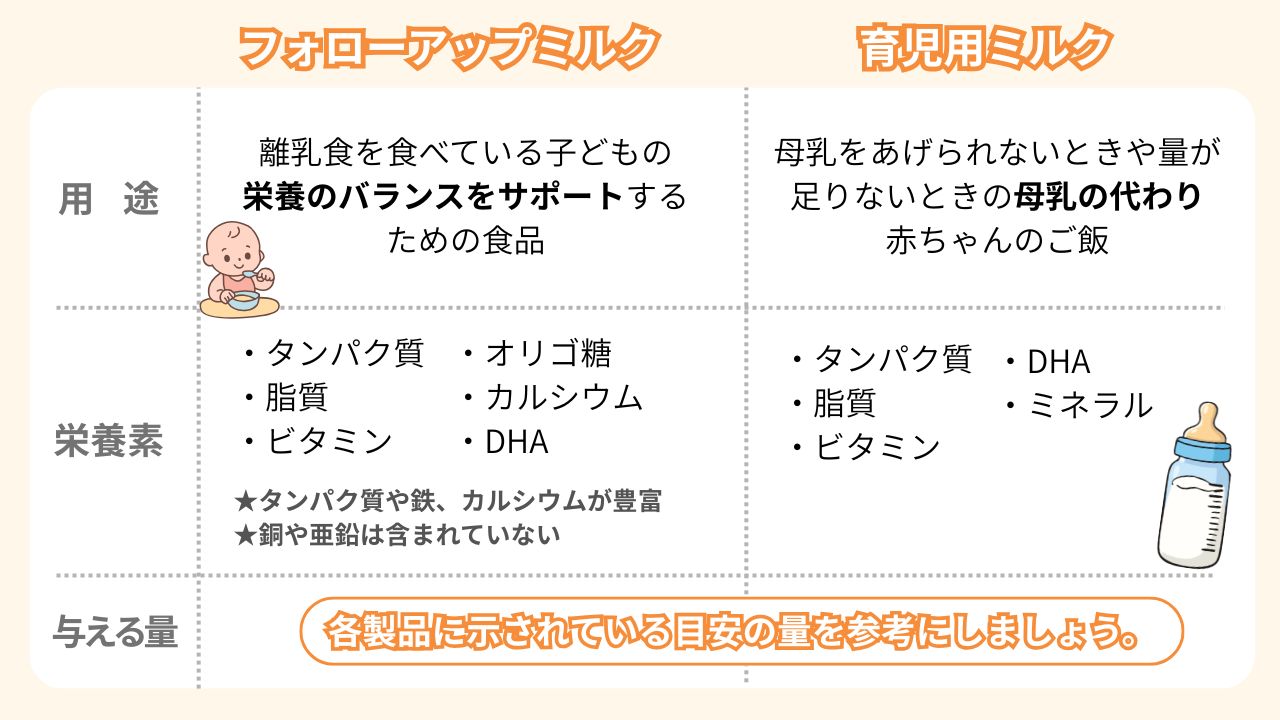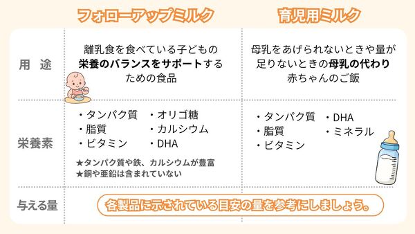 フォローアップミルクと育児用ミルクの用途の違いは以下の通りです。
