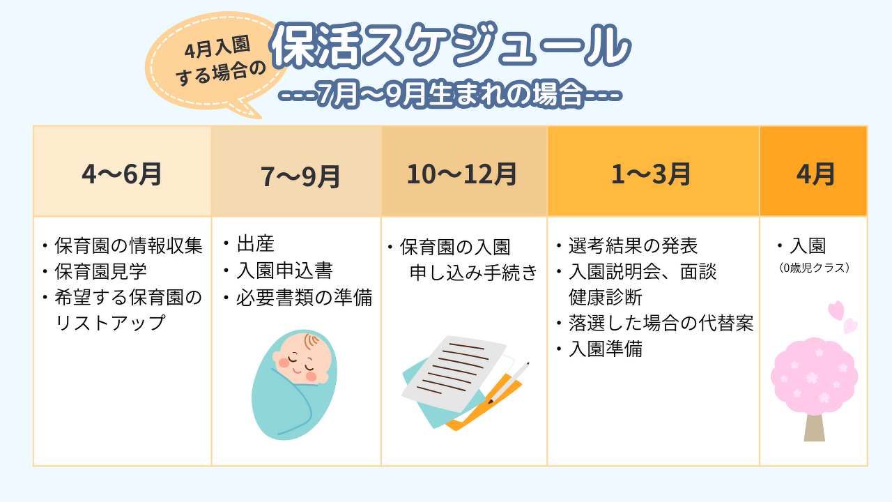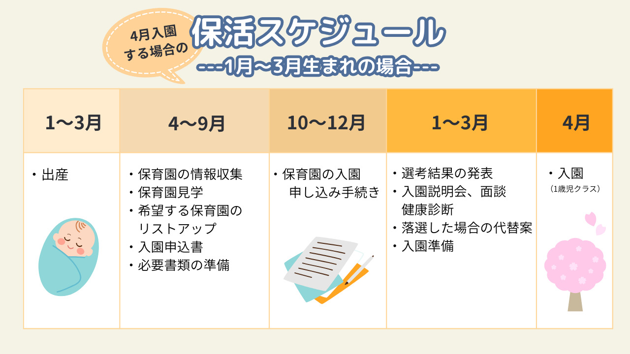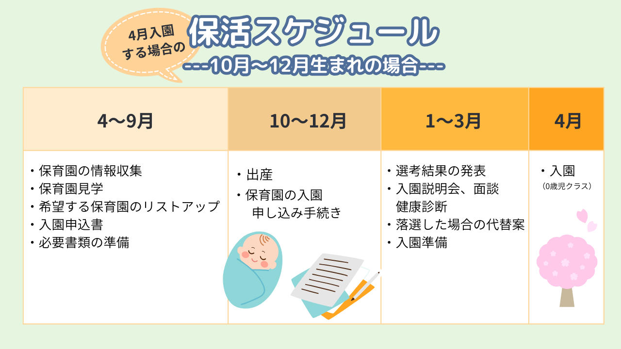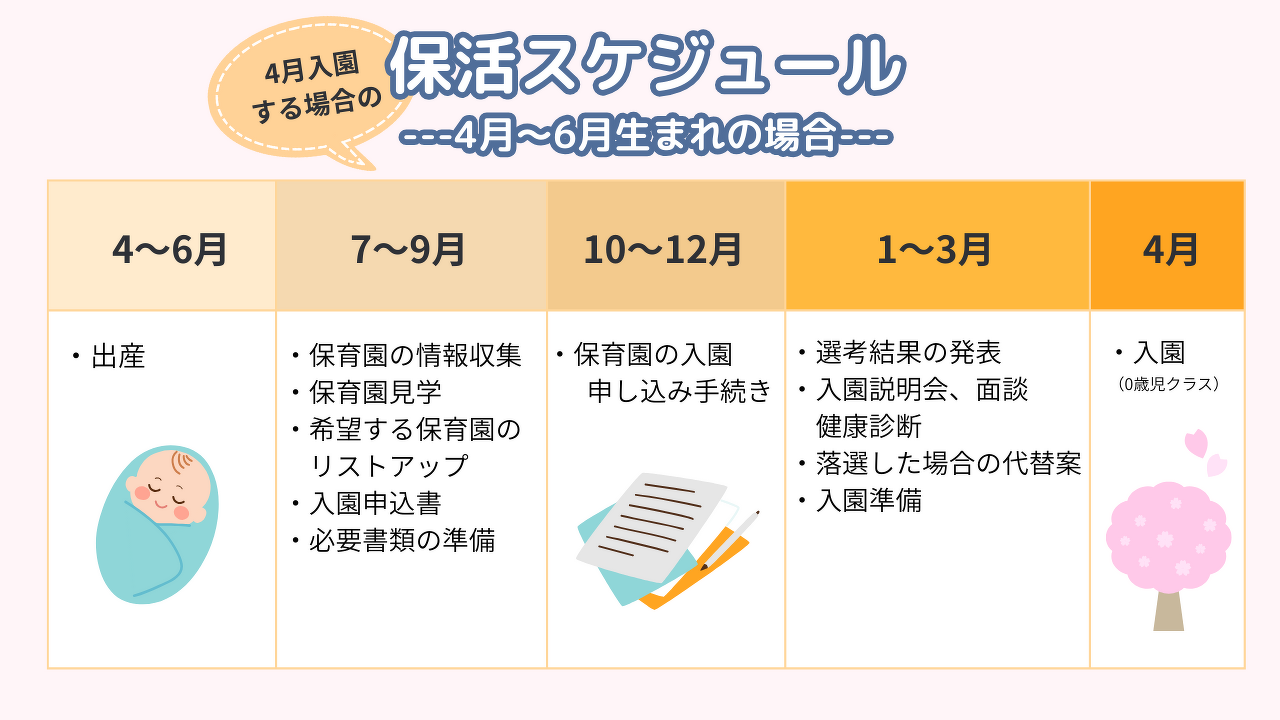 認可保育園に4月入園する場合の保活スケジュールを、生まれ月別に紹介します。