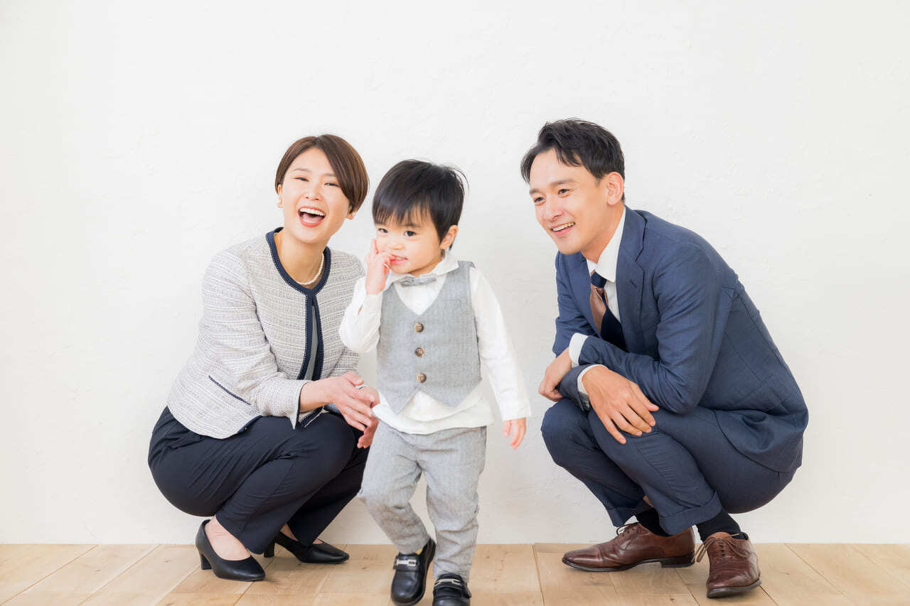 パパは無地のスーツに白のワイシャツ、ネクタイや靴下は落ち着いたベーシックカラーのものを選びましょう。