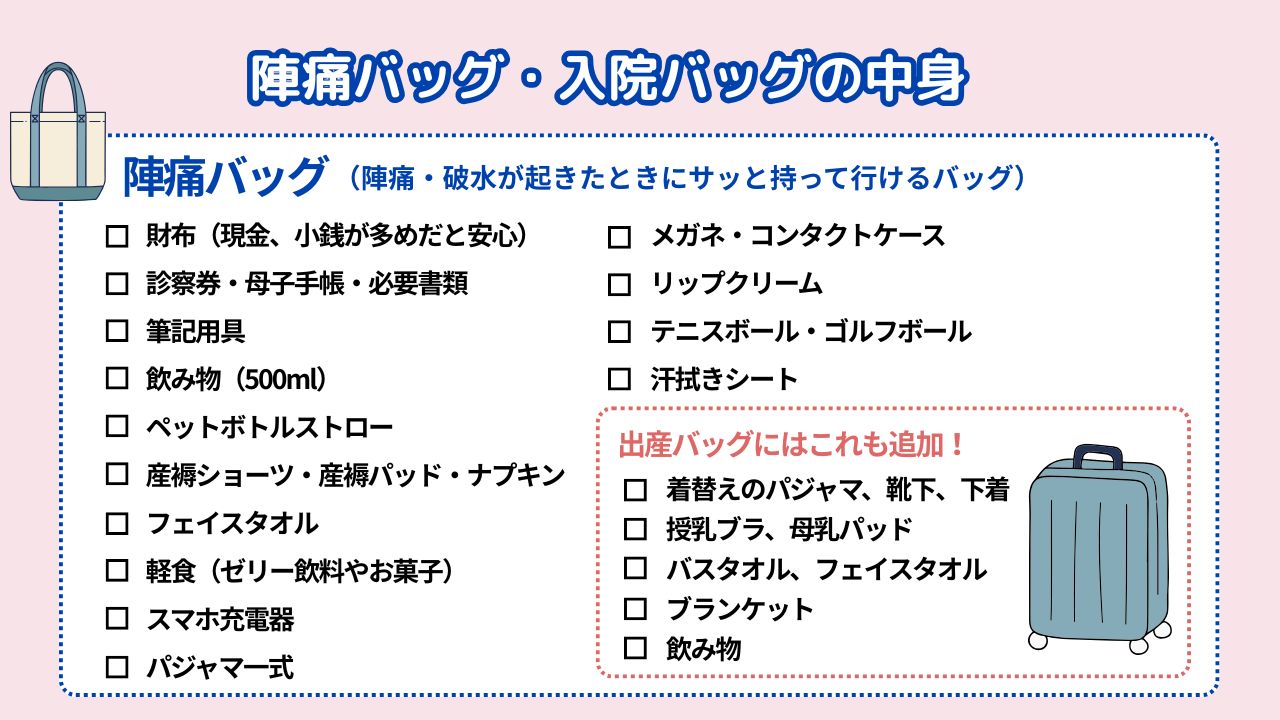 そのときに備えて、陣痛・破水が起きたときにサッと持って行ける「陣痛バッグ」と入院準備品を一式入れた「出産バッグ」を準備しましょう。