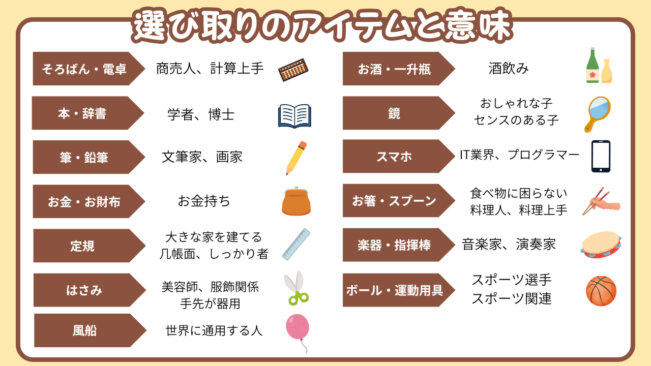 以下に、選び取りによく使われるアイテムとその意味をご紹介します。