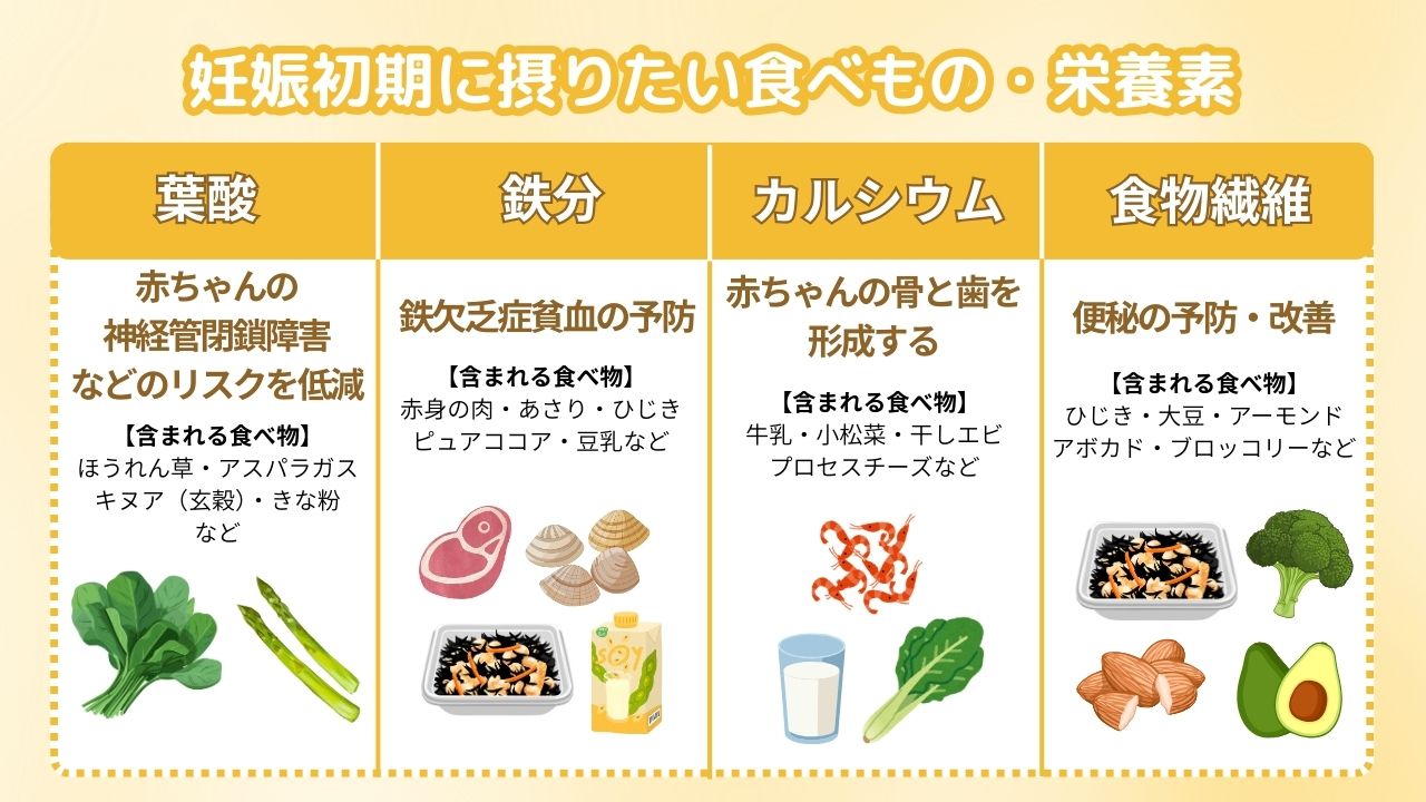 妊娠初期から積極的に摂取したい食べ物や栄養素には、葉酸や鉄分、カルシウム、食物繊維などがあげられます。