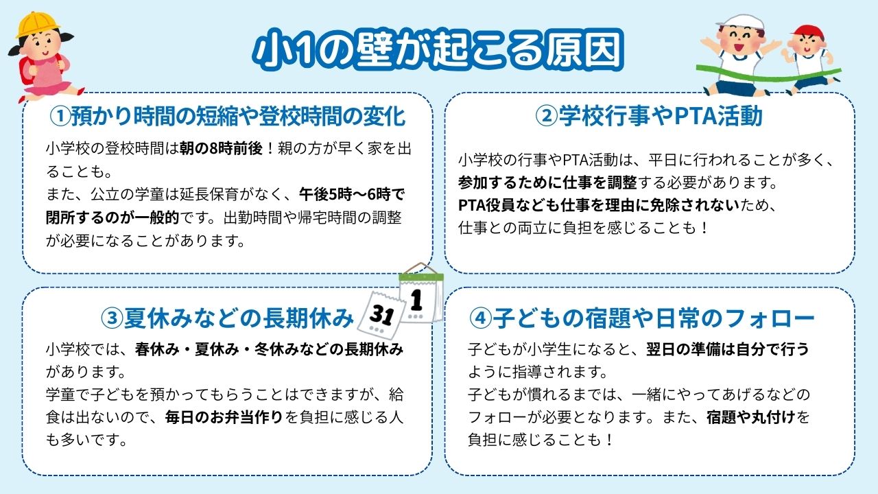 「小1の壁」では、ママやパパの心配事や負担が増えるケースが多いようです。