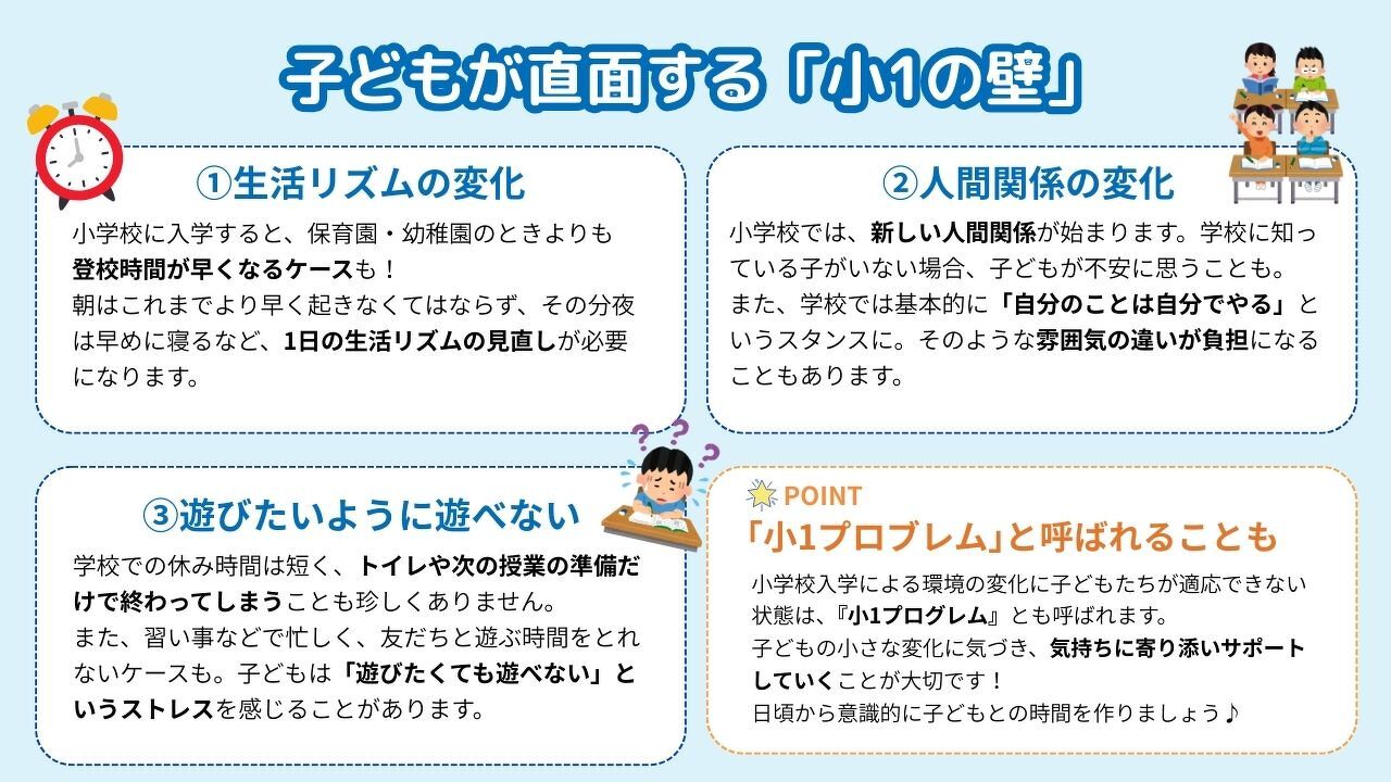 子どもたちにとって、小学校入学にともなう生活の変化は大人が思うより大きく、初めての壁となる場合があります。