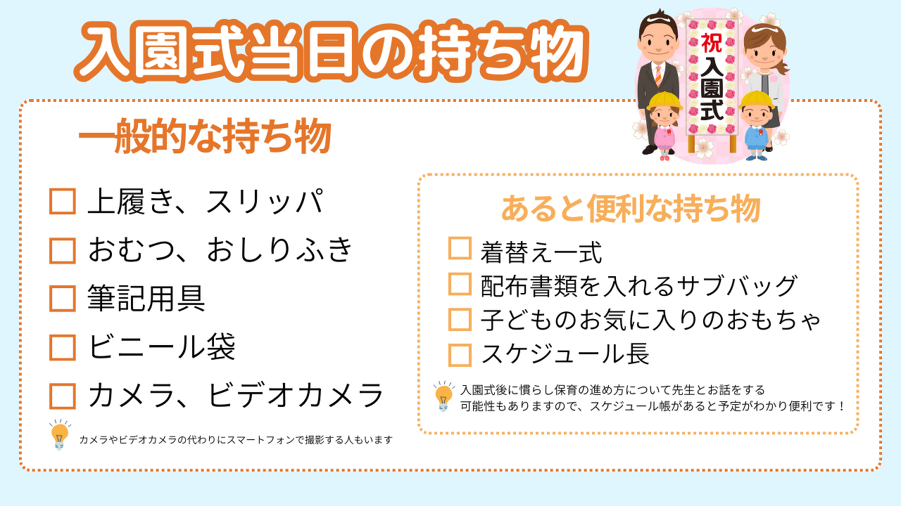 一般的な持ち物としては、最低限の子どもの荷物と園で履く上履き、式の様子を撮影するカメラやビデオカメラがあります。カメラやビデオカメラの代わりにスマートフォンで撮影する人もいます。