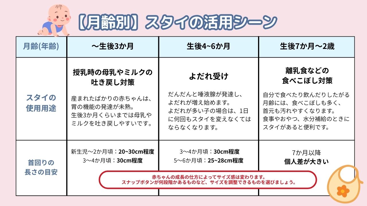 スタイは通常、洋服を汚さないためにつけるものですが、月齢によっても使用目的が変わります。