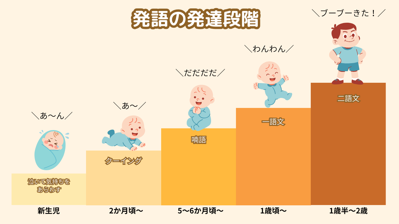 赤ちゃんの言葉の発達は泣くことから始まり、クーイングや喃語を経て、意味を持つ言葉に成長していきます。