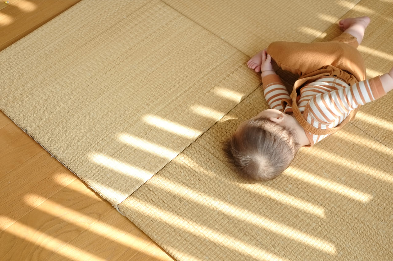 狭いスペースではなく、のびのびと体を動かせる広いスペースで過ごさせることも、寝返りのサポートになります。