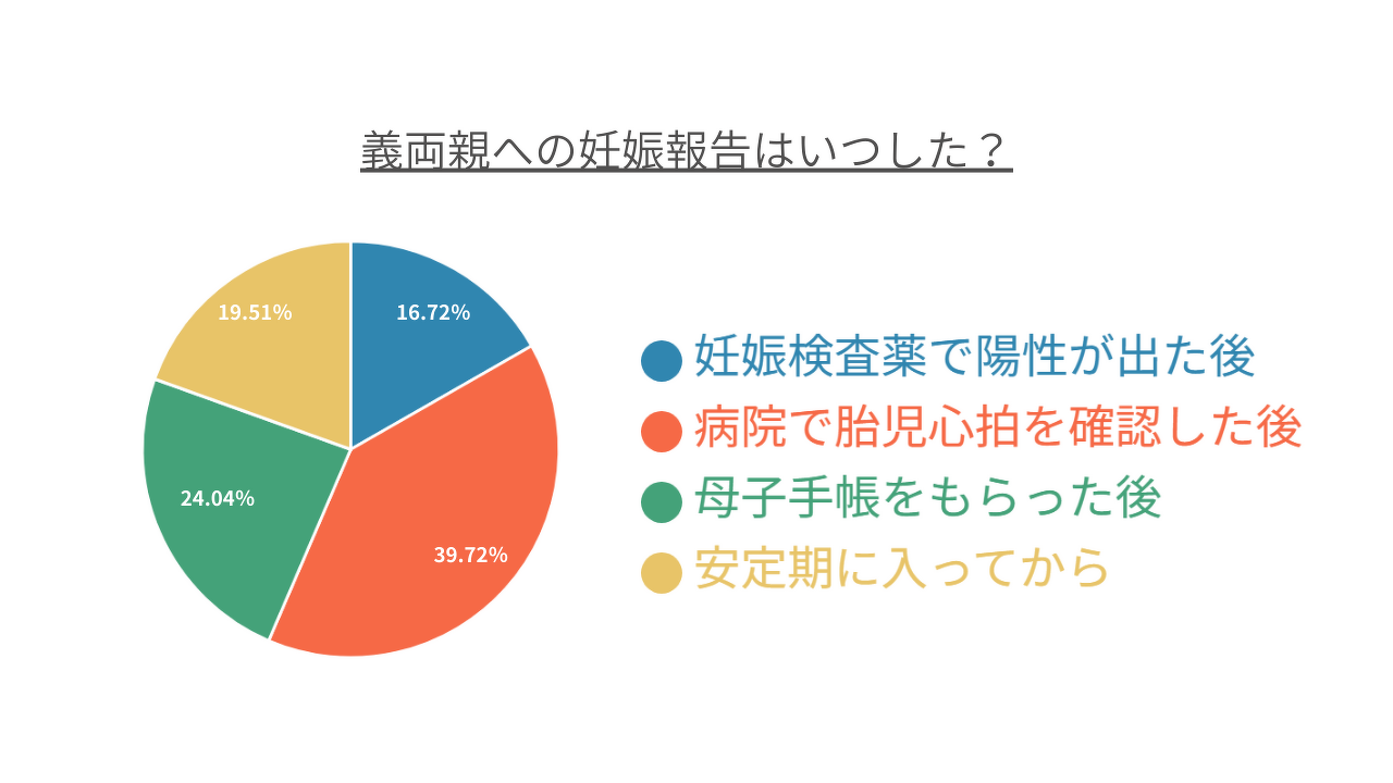 ママ自身の両親のあとに義両親に報告する人は、「余計な心配はかけたくない」という気持ちから、正常妊娠であることや心音の確認が取れてから報告しています。